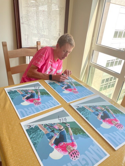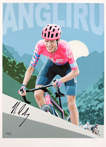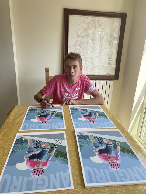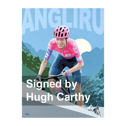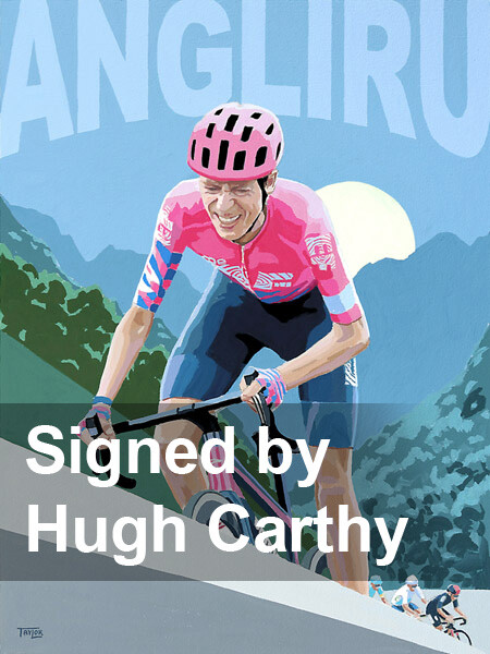 This fabulous Giclée print is a reproduction of Simon's painting celebrating Hugh Carthy's incredible win on perhaps the hardest climb in professional cycling history, the daunting Angliru, on stage 12 of the 2020 La Vuelta.