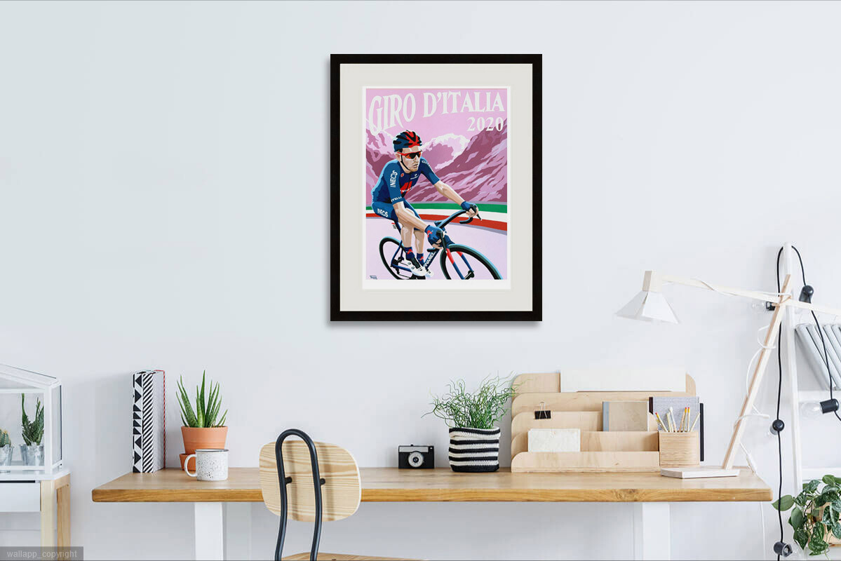 This stylish Giclée print is a reproduction of Simon's painting celebrating Tao Geoghegan Hart's wonderful 2020 Giro D'Italia victory.