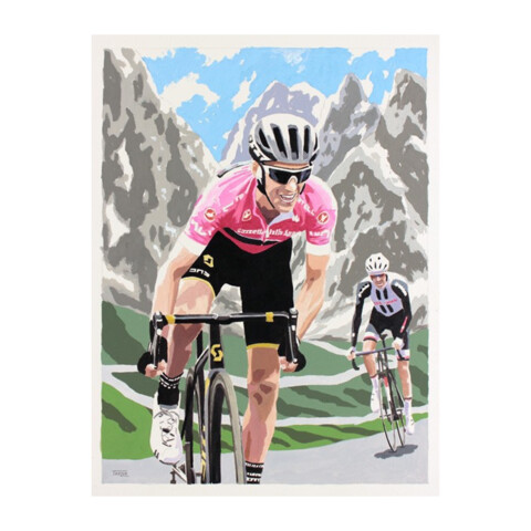 This atmospheric Giclée print, features Simon Yates in the leaders jersey of the Giro D'Italia, which he was to hold for 14 days, leading Tom Dumoulin. Reproduced from Simon's mixed media painting on paper, painted in a looser style than usual to capture the Spring light and feel of the Giro D'Italia.