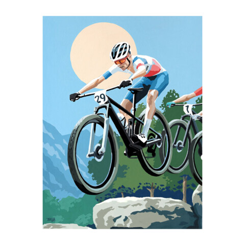 This dynamic Giclée print features Simon's painting celebrating Tom Pidock's incredible and dominant victory at the Tokyo Olympics in the Mountain Bike Cross Country race.