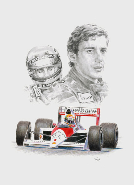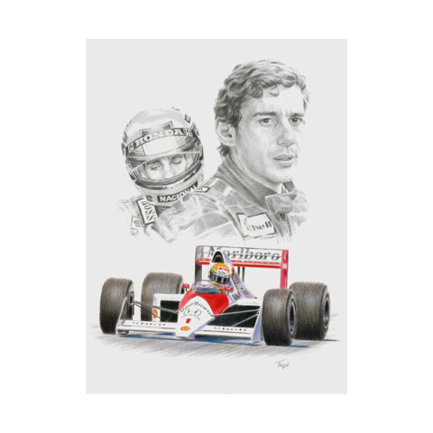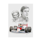 This formula 1 Giclée print features pencil drawn portraits of Ayrton Senna, and a colour pencil illustration of Ayrton at the wheel of the McLaren MP4/4.