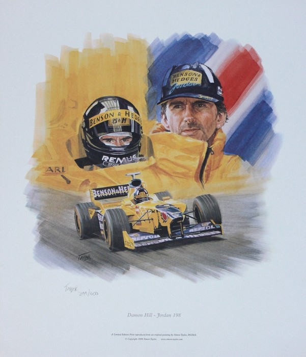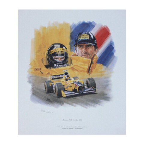 This formula 1 print features portraits of Damon Hill, and his Jordan 198 which he drove so successfully in 1998, showing off his driving talent to disprove those who claimed he could only win in a dominant Williams car. This was part of a series of prints released in 1998 which marked a departure for my work away from pencil drawing into painted works.
