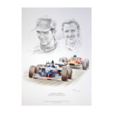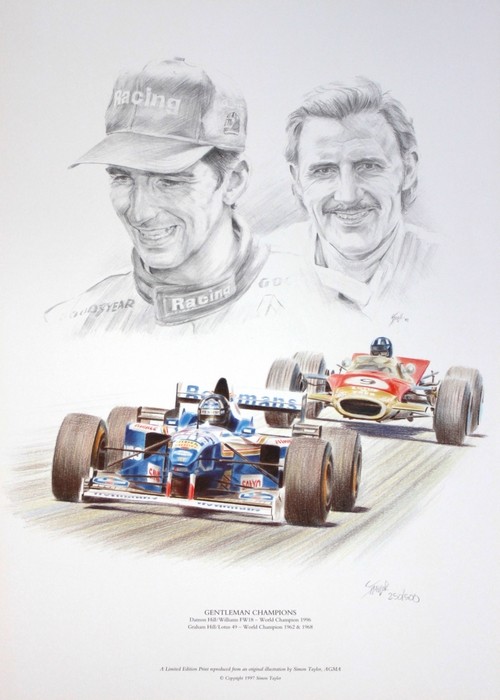 This formula 1 print features pencil drawn portraits of Damon and his father Graham Hill, with their championship winning cars, Damon's Williams FW18 in which he won the 1996 Championship, and Graham in his Lotus 49 in which he secured his 2nd championship title in 1968, having previously won in 1962.