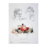 This formula 1 print published in 1994 features pencil drawn portraits of Gerhard Berger, and at the wheel of the Ferrari 412T1/B.