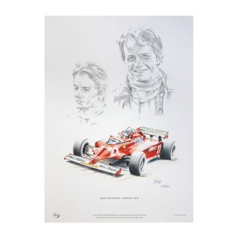 This formula 1 print features pencil drawn portraits of Gilles Villeneuve, and at the wheel of the Ferrari 126CK which he drove in the 1981 season. This is my favourite of my editions and I believe the most evocative.