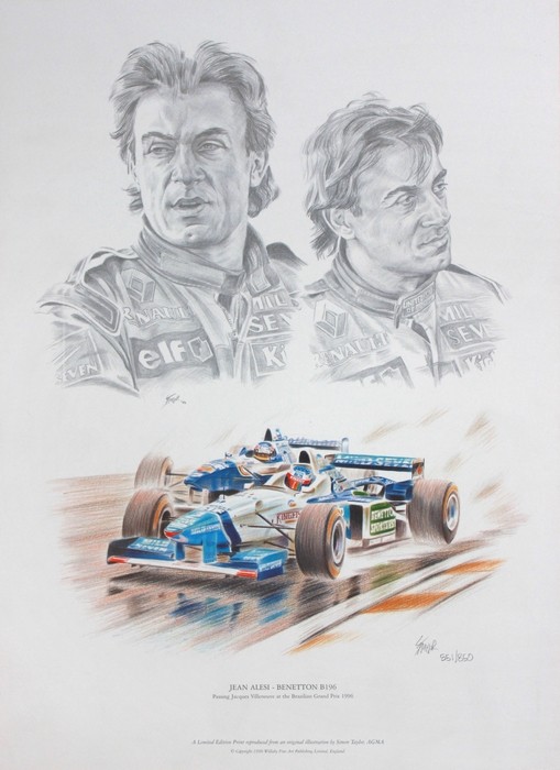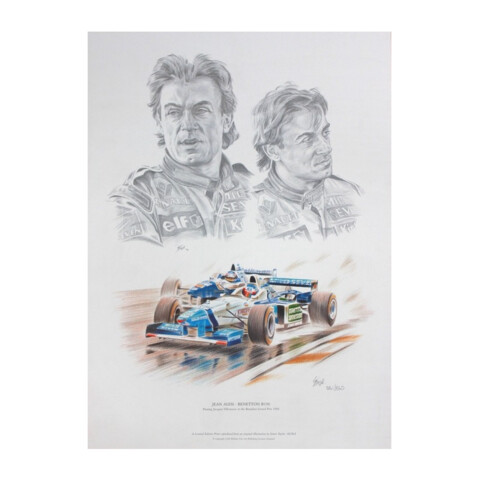 This formula 1 print features pencil drawn portraits of Jean Alesi, and at the wheel of the Benetton B196 passing Jacques Villeneuve during the wet Brazilian Grand Prix. The season looked promising for Benetton before the season having won the championship the previous two years, and now employing Jean Alesi and Gerhard Berger. Unfortunately, the Williams car was in a different league, and Benetton were on a down turn in fortunes.