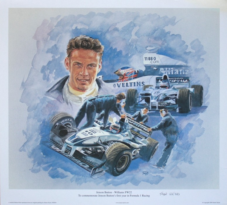 This formula 1 print commemorates Jensen's debut season with a montage of images, and his Williams FW22 which he raced in his debut season in 2000.