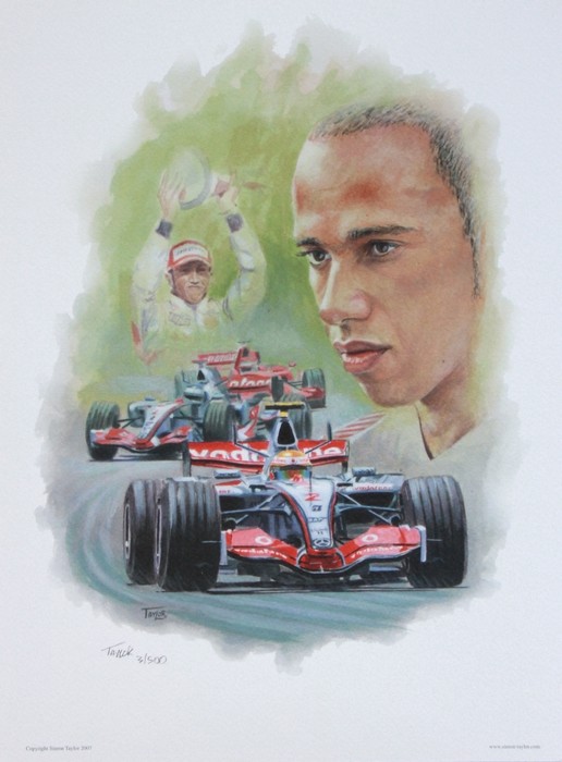 To celebrate Lewis Hamilton's amazing debut year in Formula 1 when he just got pipped to the title by Kimi Raikkonen. Each Giclée print measures 300 x 400mm approx. and is printed on acid free 260gsm fine quality textured art paper using lightfast inks. The edition is limited to 500 copies, each hand signed and numbered by Simon.