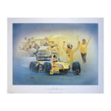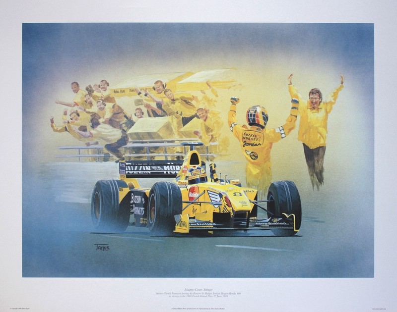 Each print measures 675 x 520mm approx. and is printed on fine quality paper. This superb edition was commissioned by Heinz-Harald and given to the Jordan Team in 1999 to celebrate his win in Magny Cours and his third place in the World Championship. I have a small number of artist proof copies.