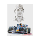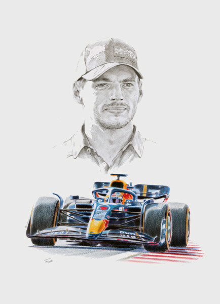 This formula 1 Giclée print features pencil drawn portraits of Max Verstappen, and a colour pencil illustration of Max at the wheel of the all conquering 2023 Red Bull RB19.