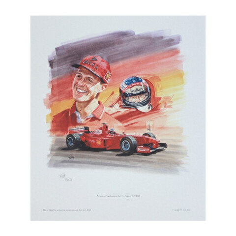 This formula 1 print features portraits of Michael Schumacher, with his Ferrari F300. In 1998 Michael fought a titanic battle with Mika Hakkinen who eventually won the title. This was part of a series of prints released in 1998 which marked a departure for my work away from pencil drawing into painted works.