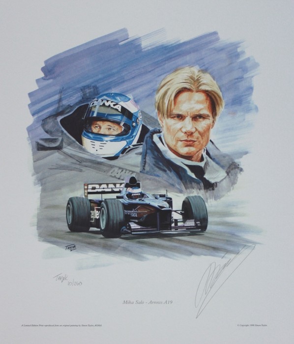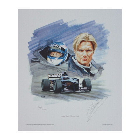 Special edition autographed by Mika Salo featuring Mika Salo and the Arrows A19 which he drove in the 1998 season. Each print measures 326 x 380mm approx. and is printed on fine quality paper. The edition is limited to just 250 copies, and each print is autographed by Mika Salo, and hand signed and numbered by Simon Taylor.