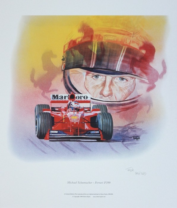 This formula 1 print features portraits of Michael Schumacher, with his Ferrari F399. Again fighting a titanic battle with Mika Hakkinen who eventually won the title for the second year.