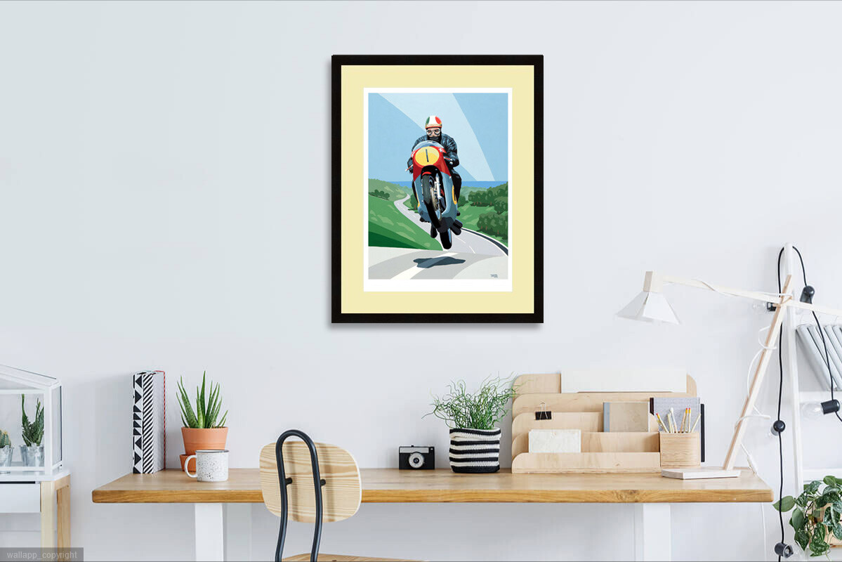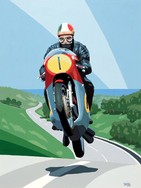 This wonderful Giclée print is a reproduction of Simon's painting featuring motorcyle legend Giacomo Agostini on his MV Augusta. Giacomo won 15 World Championship titles, and 10 TT victories.