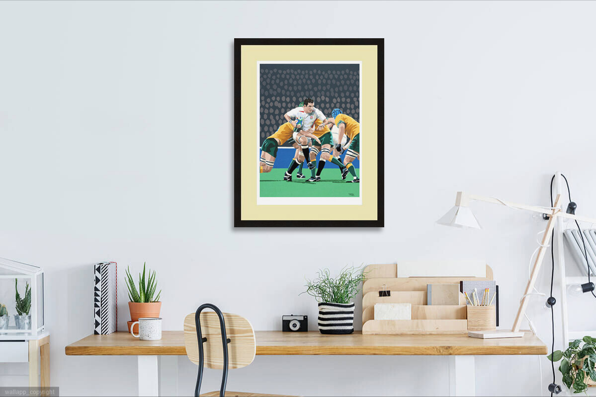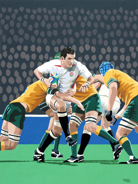 This wonderful Giclée print is a reproduction of Simon's painting celebrating England’s success in the 2003 Rugby World Cup final, depicting captain Martin Johnson battling in the thick of the action.