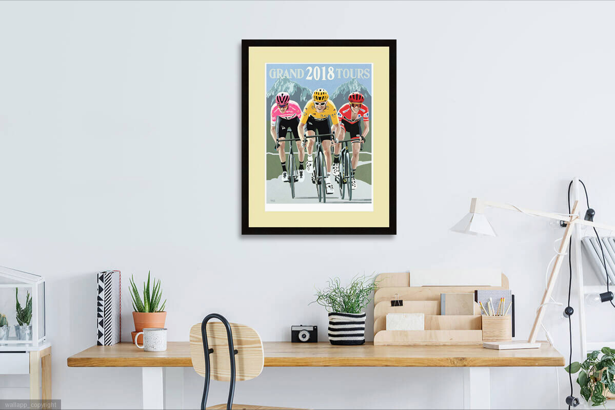 Simon Taylor's painting celebrating the incredible and unprecedented triple british success at the 2018 grand tours, with Chris Froome winning the Giro D'Italia, Geraint Thomas winning the Tour de France, and Simon Yates winning La Vualta a Espana.