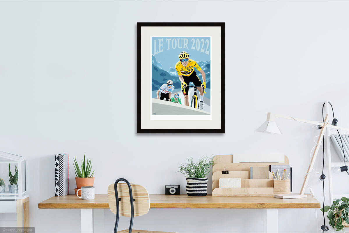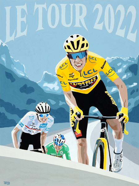 Simon's original painting featuring the 2022 Tour de France featuring the riders who dominated the Tour, Jonas Vingegaard in the yellow jersey en route to victory, leading rival Tadej Pogacar and super domestique and green jersey wearer Wout Van Aert.