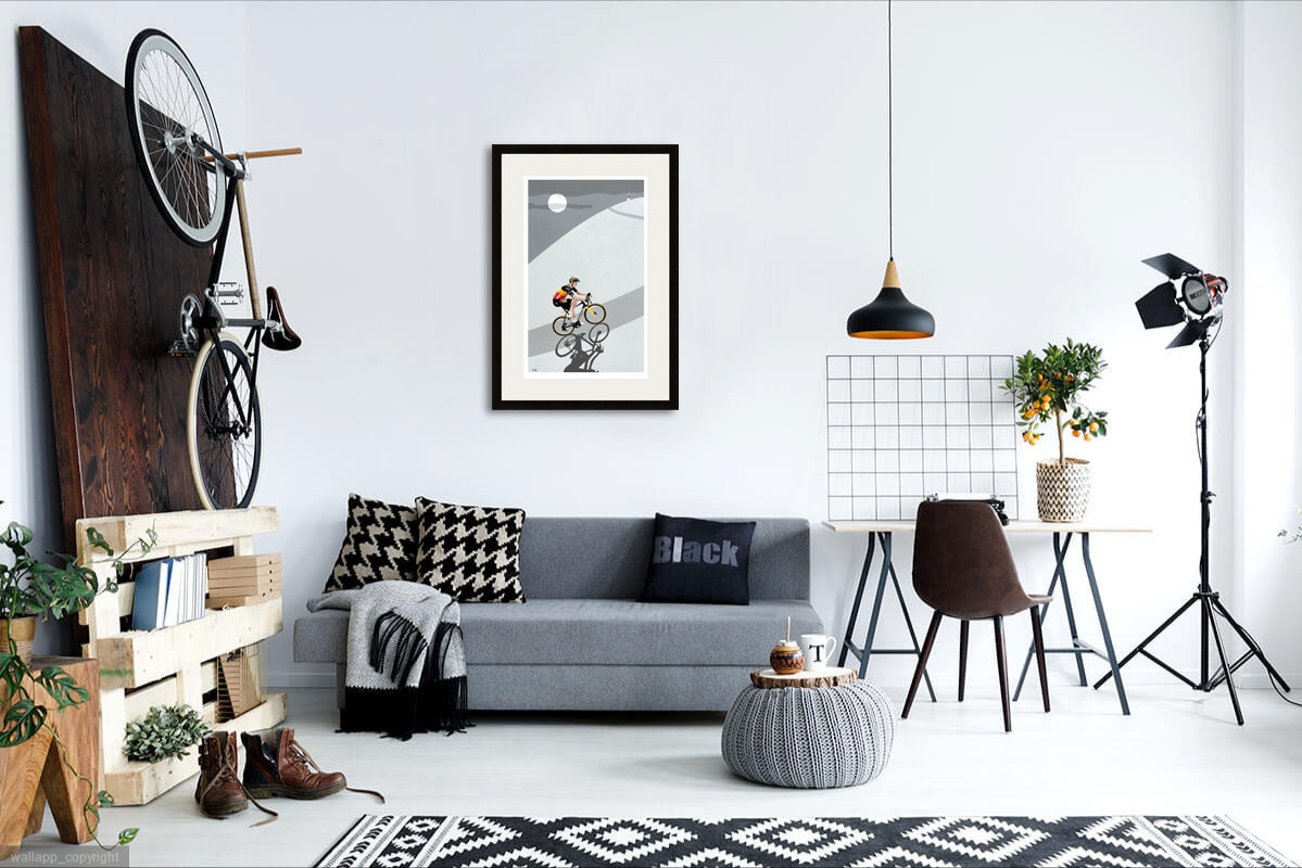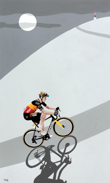 Simon's original painting is a stylised depiction of Wout Van Aert on Mont Ventoux, where he won stage 11 of the Tour de france 2021 which included two ascents of the famous mountain. After launching an attack 11km from the summit of Mont Ventoux on the second ascent, he held his advantage on the long, twisting descent to the finish in Malaucène for a stunning solo victory.