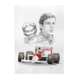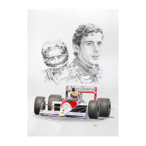 Exquisite drawing of Ayrton Senna and the McLaren MP4/5 by Simon Taylor. Featuring a double pencil drawn portrait with and without helmet and colour pencil illustration of the car at speed.