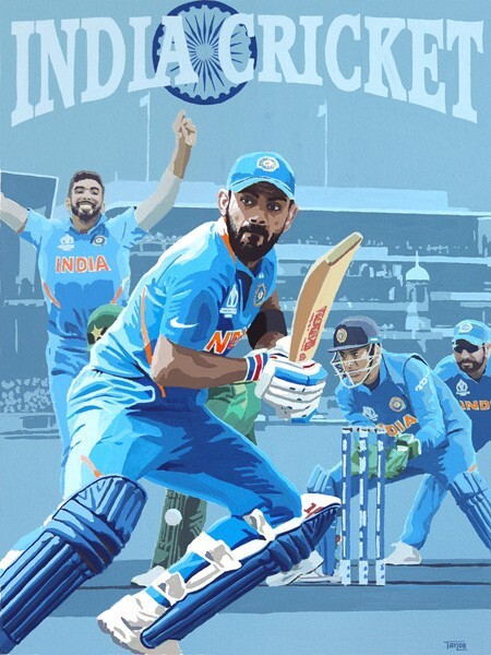 Simon Taylor's painting celebrating the India Cricket Team featuring a montage of Virat Kholi, Jasprit Bumrah, MS Dhoni & Rohit Sharma.
