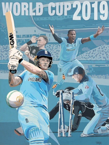 Simon Taylor's painting celebrating England’s success in the amazing Cricket World Cup final. Both New Zealand and England scored 241 in their 50 overs, and the match was decided by a Super Over. Featuring a montage of the key players Ben Stokes, Jofra Archer and Jos Buttler who secured the defining run-out which sealed the win for England.
