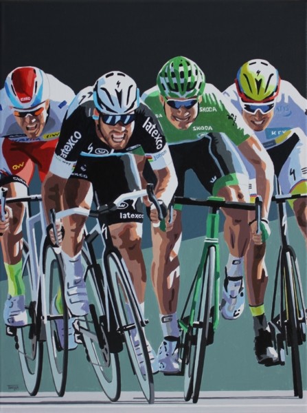 Simon Taylor's painting capturing all the colour and drama of a modern sprint finish, and takes stage 7 of this years Tour as the subject, where Mark Cavendish secured his 26th Tour de France stage victory, an outstanding achievement.