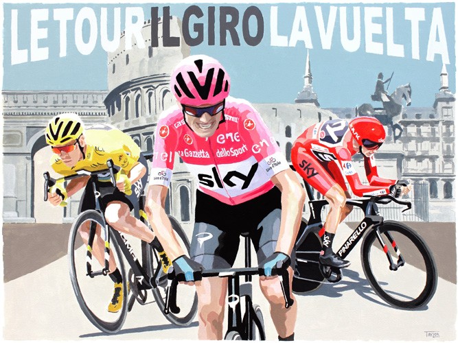 A privately commissioned painting by Simon Taylor celebrating Chris Froome's historic Tour Treble.