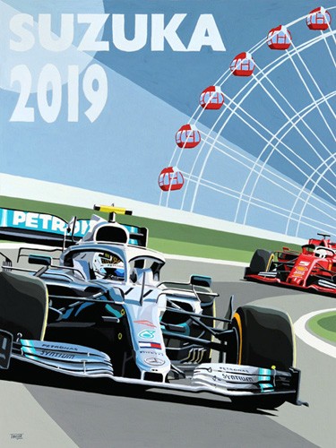 Simon Taylor's original painting of Valtteri Bottas driving to victory at Suzuka in 2019. In Simon's iconic style featuring bold colours and clean design.