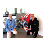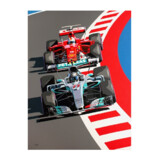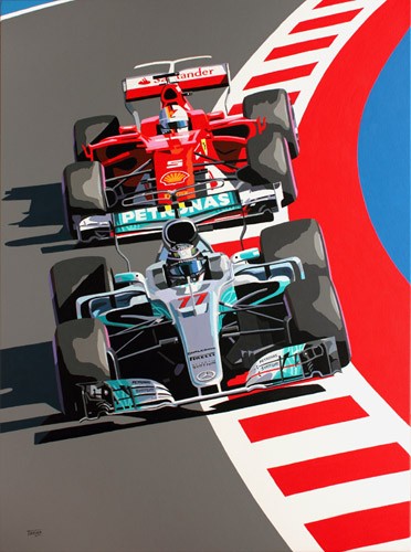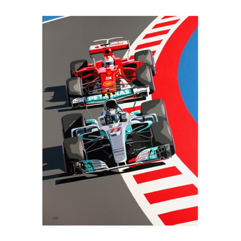 Simon Taylor's original painting celebrating Valtteri Bottas leading Vettel to his first F1 victory in Socchi 2017. In Simon's iconic style featuring bold colours and clean design.