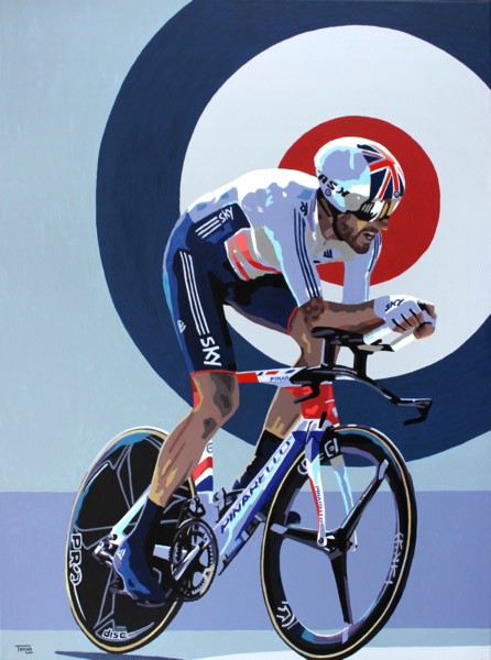 Simon Taylor's iconic painting of Sir Bradley Wiggins riding his time trial machine en route to victory in the 2104 World Championships, with a colourful background design reflecting Bradley's style and interest in 1960's mod culture.